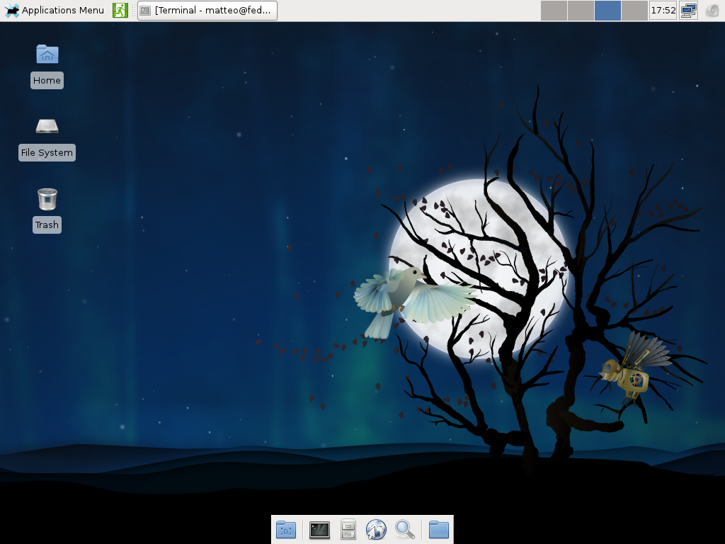 - quello in alto con il menù, l'elenco delle applicazioni aperte, un workspace switcher, l'orologio e le applet di rete e audio. Insomma, niente di strano;
