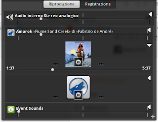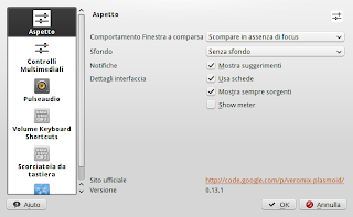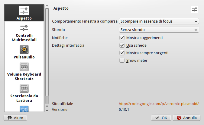 Stanco della troppo minimale applet di kmix, sono andato alla ricerca di qualche plasmoide più attrezzato, di quelli che un altro po' e ti fanno pure il caffè (anzi, il kaffè XD) e mi sono imbattuto in Veromix, che si è subito guadagnato un posto nel mio pannello principale.Il suo pregio è dunque quello di consentire una regolazione dell'audio in maniera completa, comodamente da un pannello di Plasma, diventando sostanzialmente un sostituto del tool di regolazione del volume di Pulseaudio.